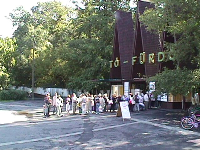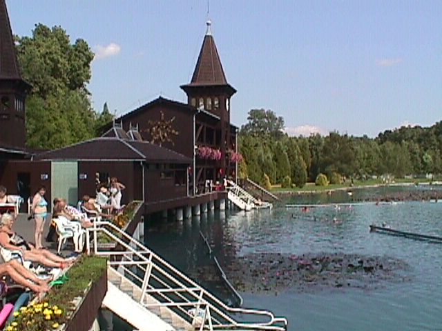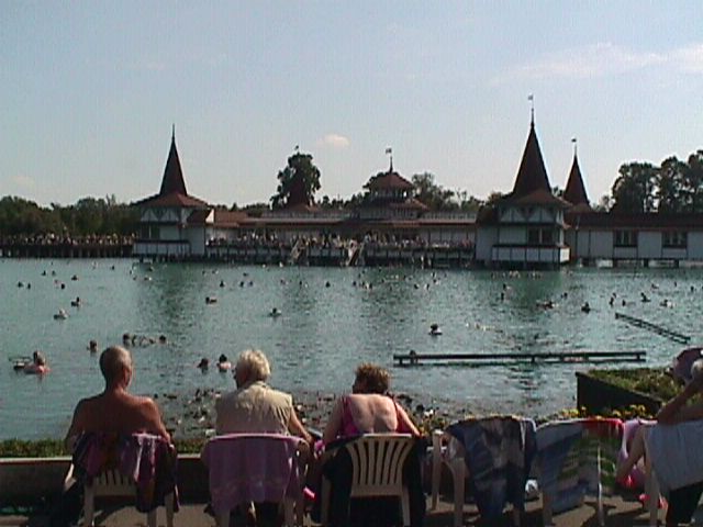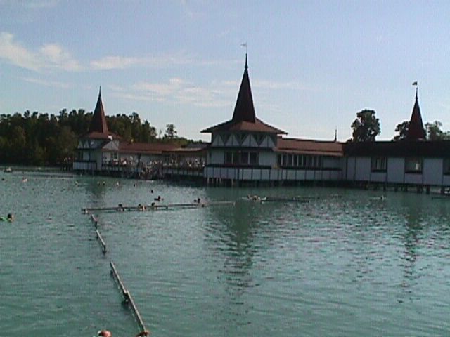 Vattnet i Balaton är varmt och skönt, bilderna ovan är tagna den 8/5 2003 och det var då redan varmare i vattnet än vi normalt har i Sverige mitt i sommaren. Stränderna är långgrunda så dom passar bra för barn. I Heviz finns en av Ungerns mest kända kurbad, en bottenlös sjö med varmt vatten hela året (varm källa). Även här kan man sola, bada samt äta och dricka gott. Utanför badet finns mängder av affärer, bufféer, restauranger och förståss den marknadsliknande shoppingplatsen där man kan köpa och äta det mesta som erbjuds i Ungern, helt suveränt gott att välja mellan alla dessa Ungerska kulinariteer.
